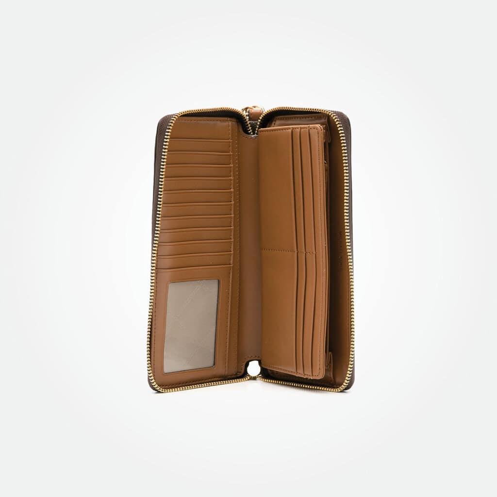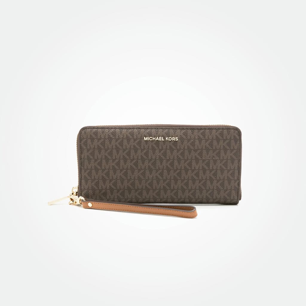 Boasting over twenty card slots and pockets, the large Michael Kors wallet was crafted to neatly organize busy everyday. Cut from leather-lined, monogrammed canvas, the design has a curved, roomy silhouette, sealed by a zip closure and accompanied by a tonal wrist strap.