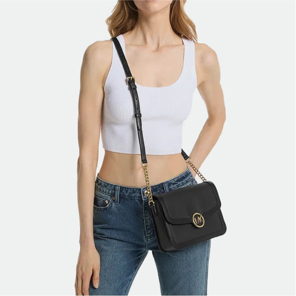 Our Leida shoulder bag combines coated canvas with luxe chain straps and smooth trim. It’s designed in a fold-over silhouette with polished logo hardware on the front and has a lined interior with a single back pocket. We think it’s an ideal day-to-night silhouette to match the season’s easygoing mood.