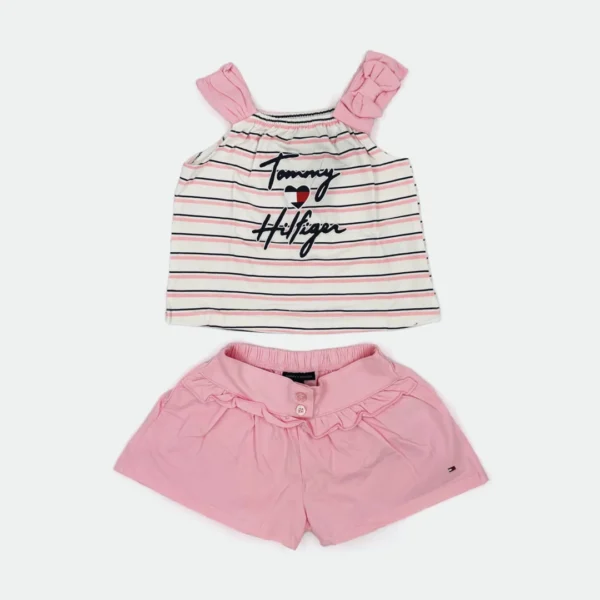 - Pink cotton tank top with straps and pinky shorts with flag print – a cute and super comfy set for your little girl!